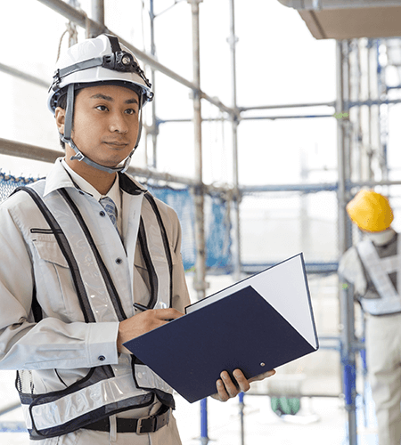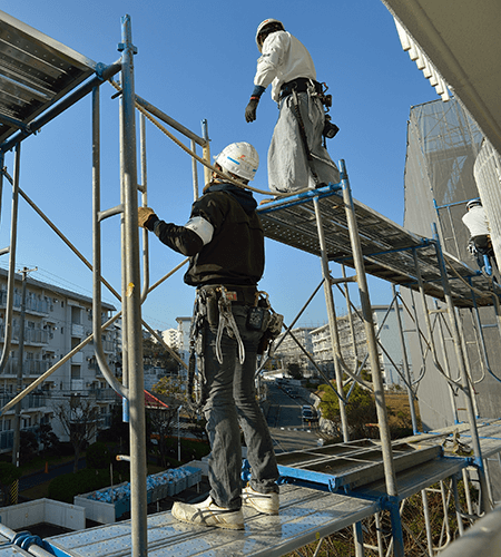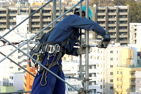 ビルや橋梁、倉庫や発電所など、様々な構造物の建設に必要となる、足場・安全設備を設置します。外壁の塗装や補修のための工事にも必要となります。当然足場の解体も含まれます。